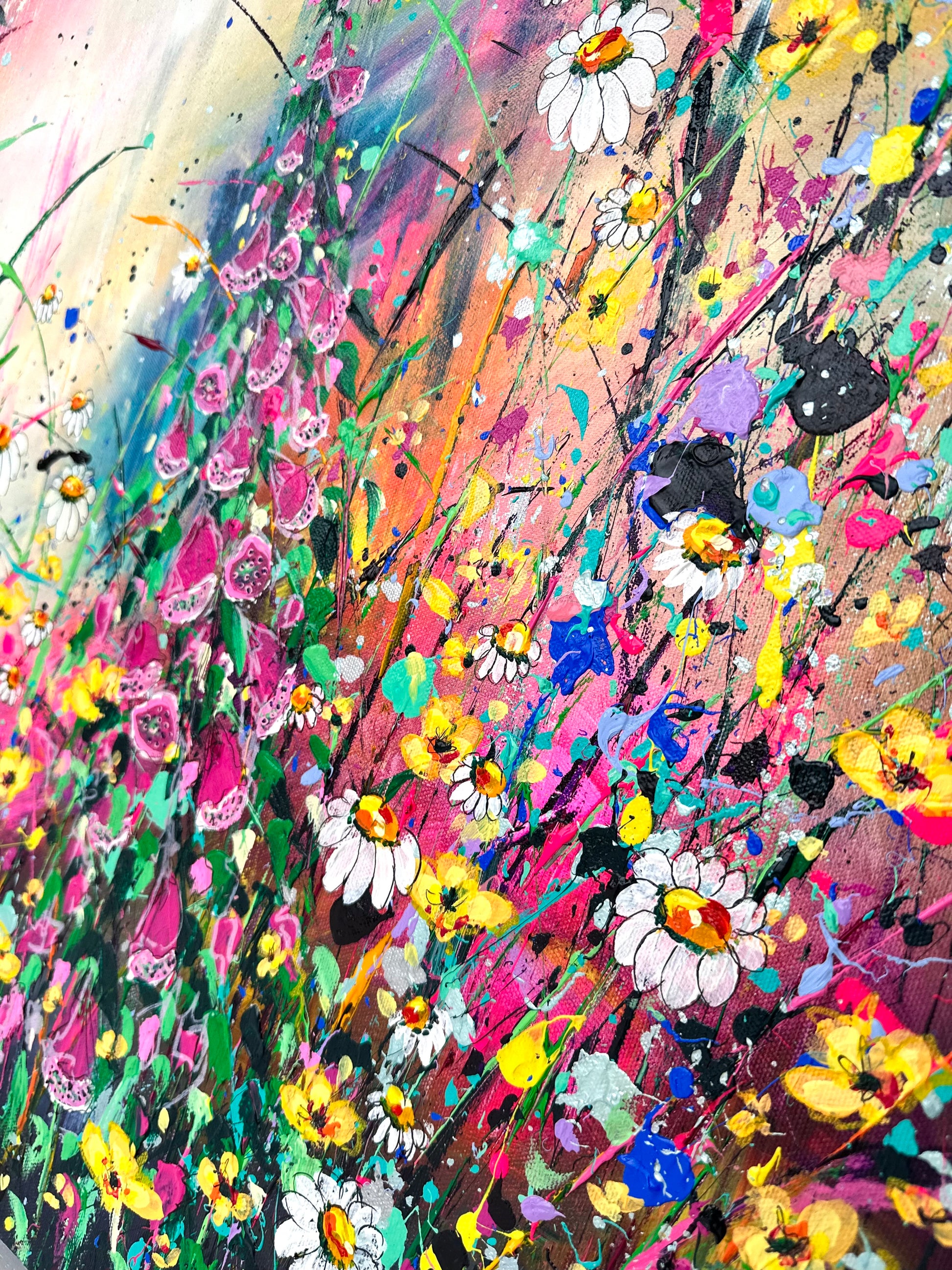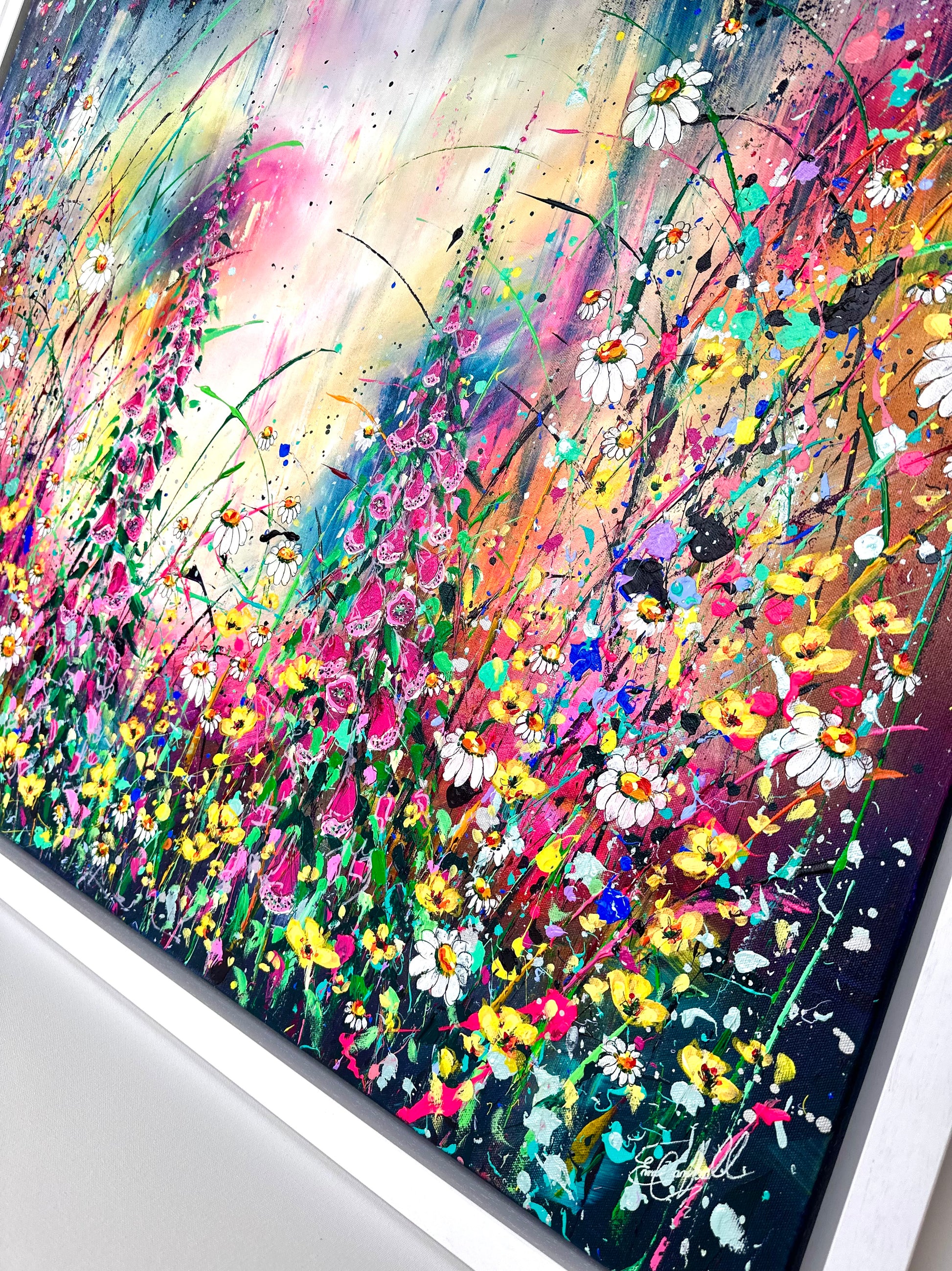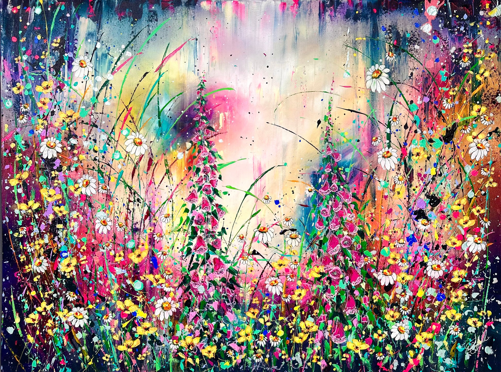 ‘Foxgloves and Buttercups' is a new original acrylic painting on canvas from my wildflower Collection. Foxgloves and Buttercups, a pair that are often found together in a wild flower meadow. Both fill me with smiles and reminiscent memories of when I was young, venturing through fields and collecting bundles of joy to bring home and draw. The painting is hand signed, varnished and prepared for hanging. It is supplied with a certificate of authenticity, measuring a total 85cm x 111cm on deep edge canvas floated and framed.