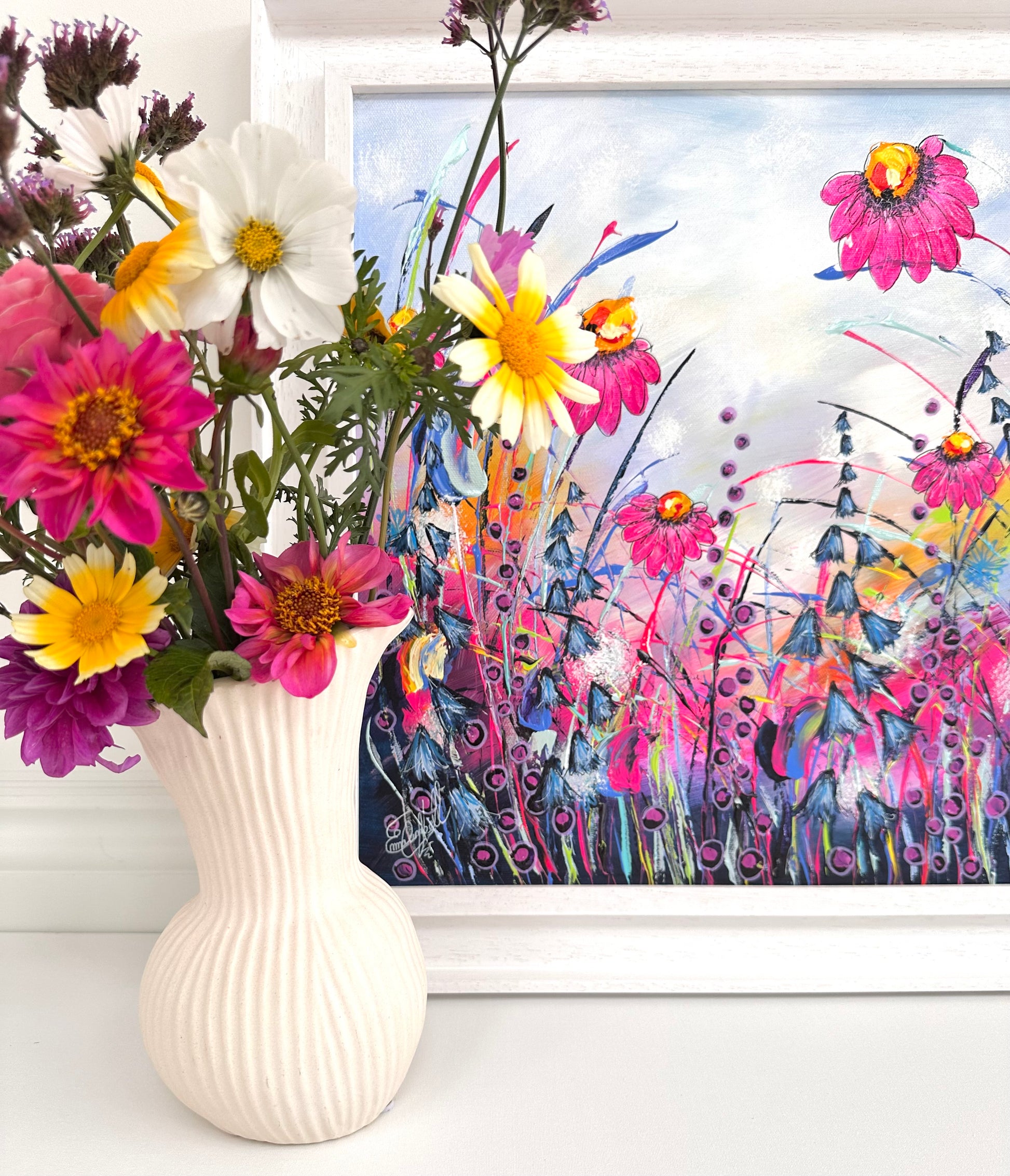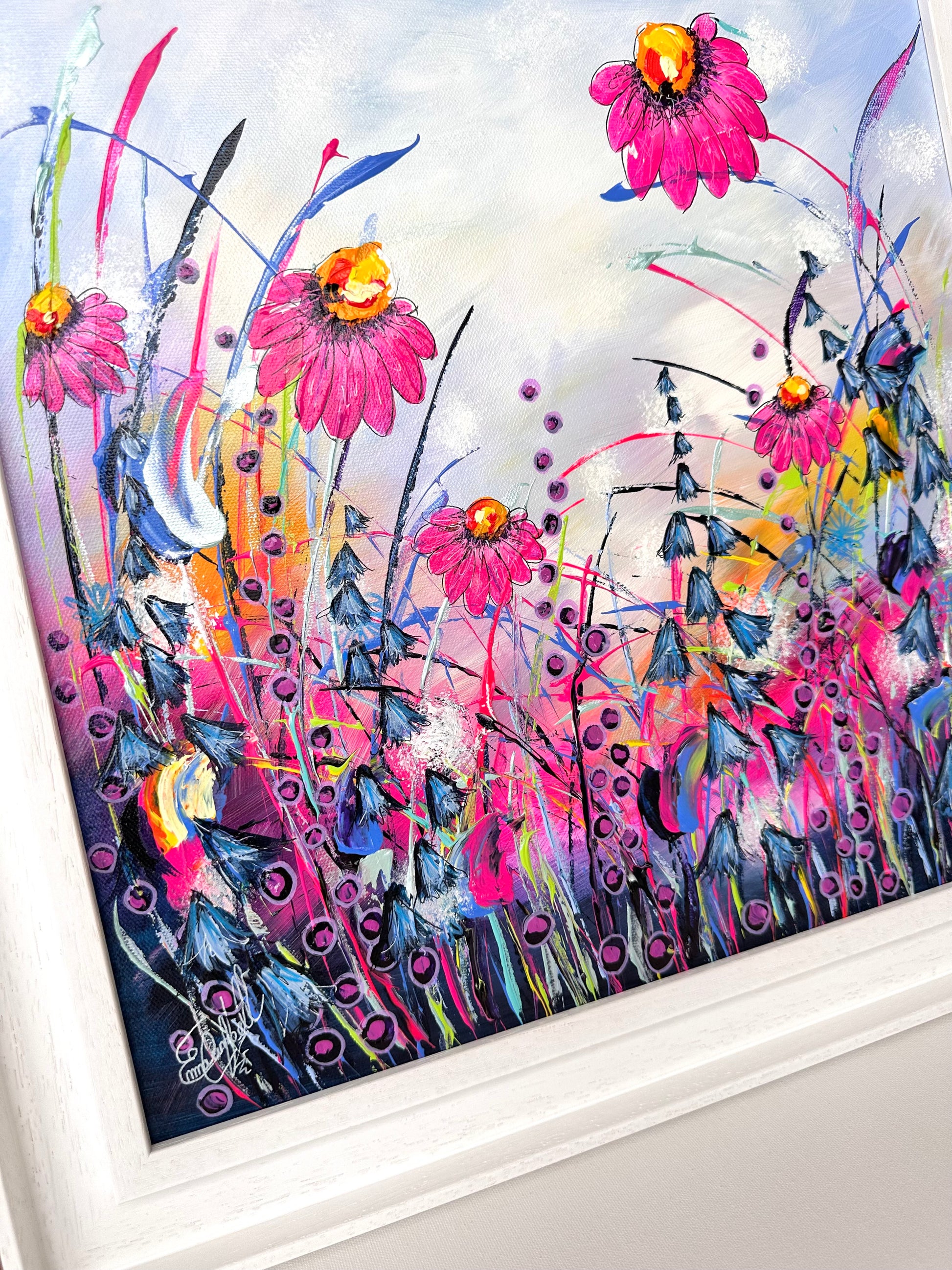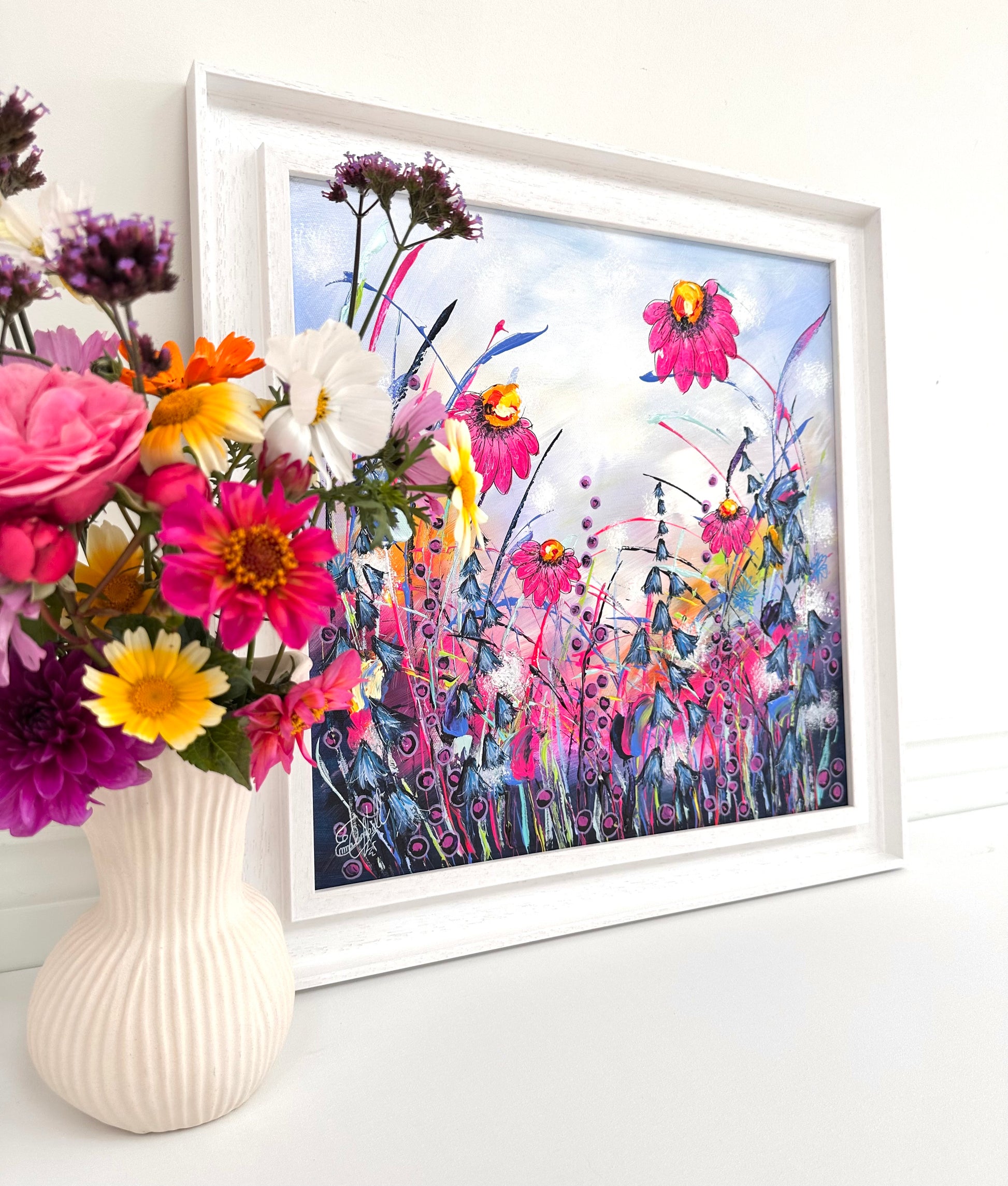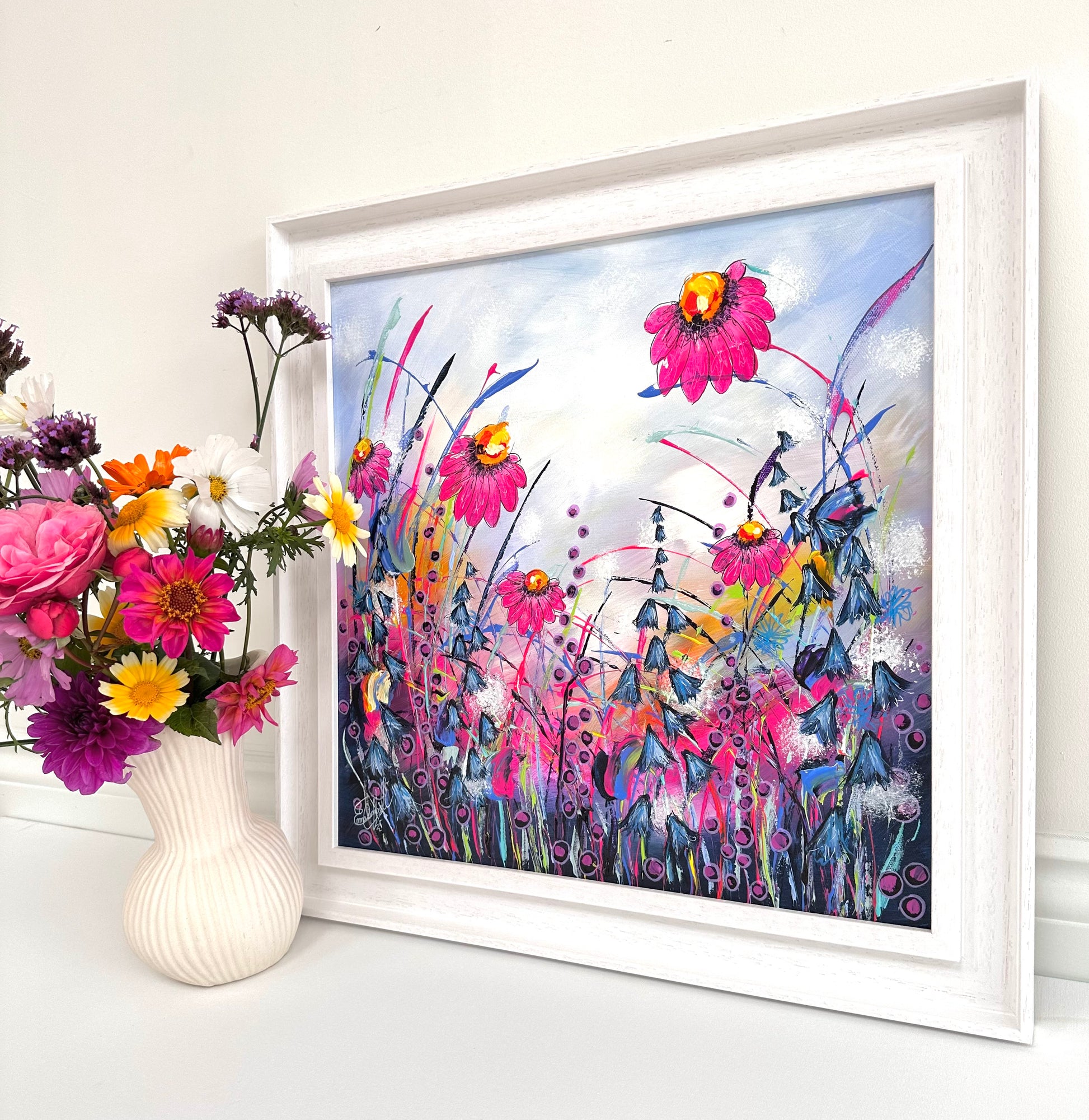 ‘Songbirds Meadow’ is a new original painting on canvas from my wildflower collection. The painting is hand signed, varnished, prepared for hanging and supplied with a certificate of authenticity. This original piece is floated and framed in an off white double tray frame, measuring a total 49cm x 49cm.