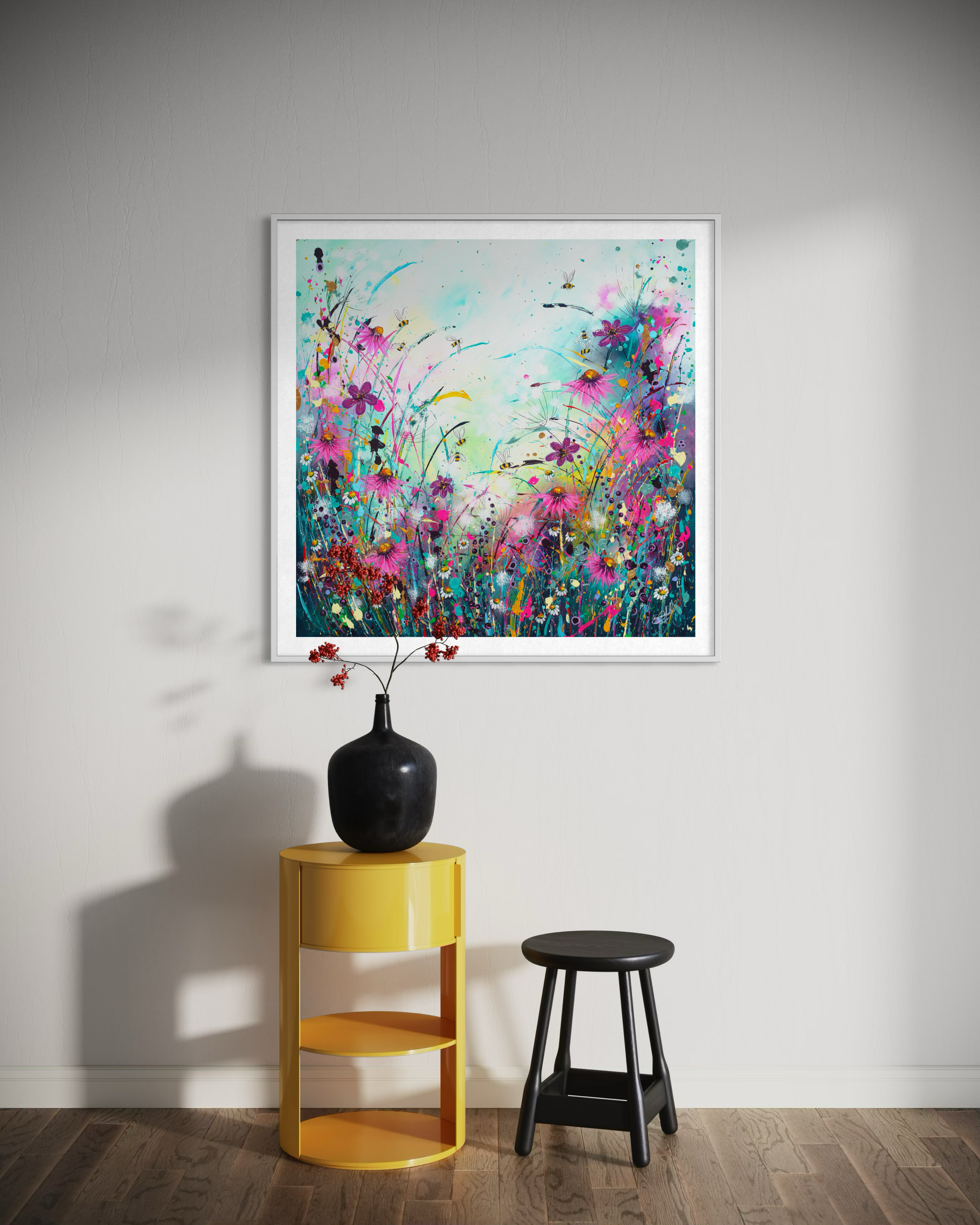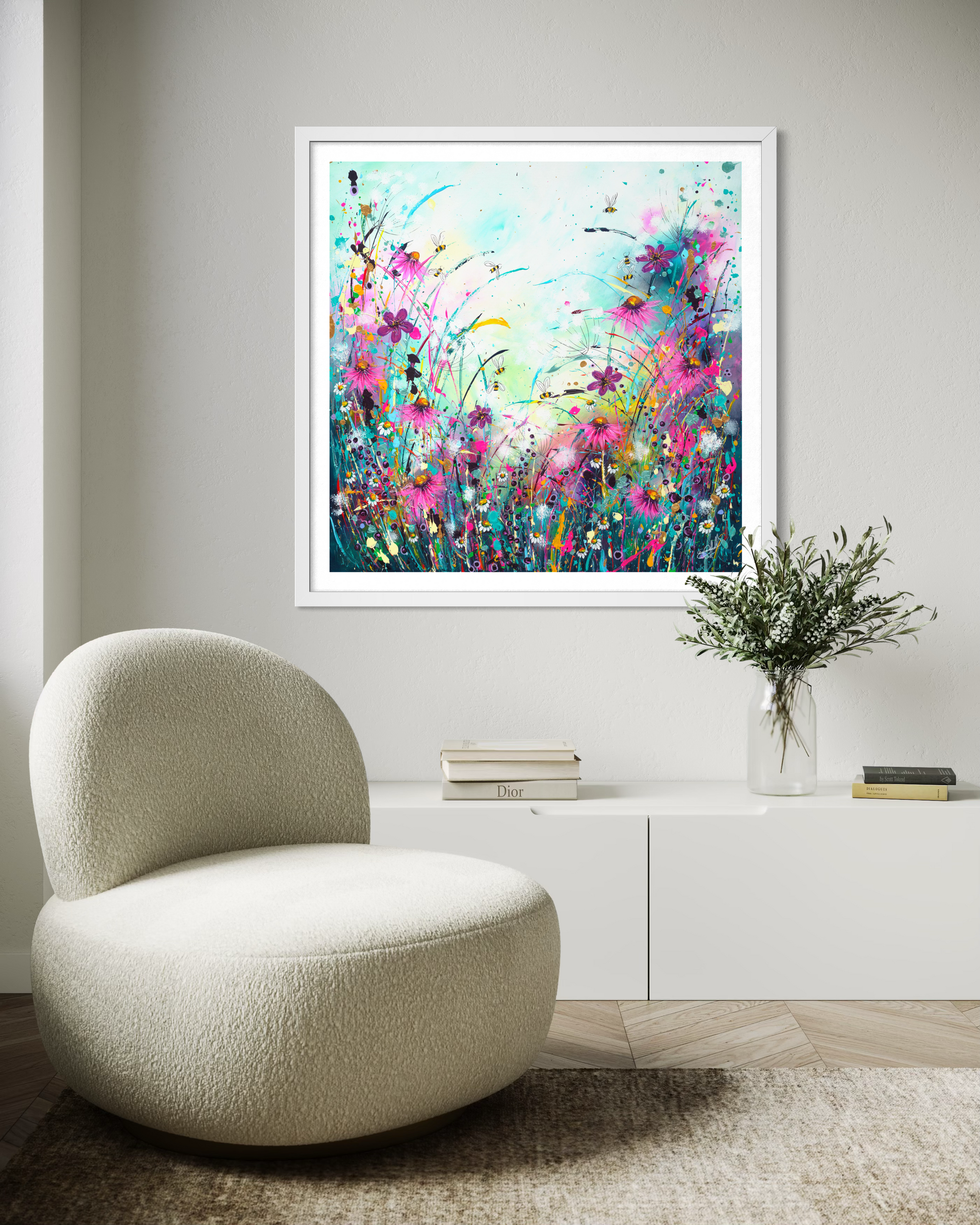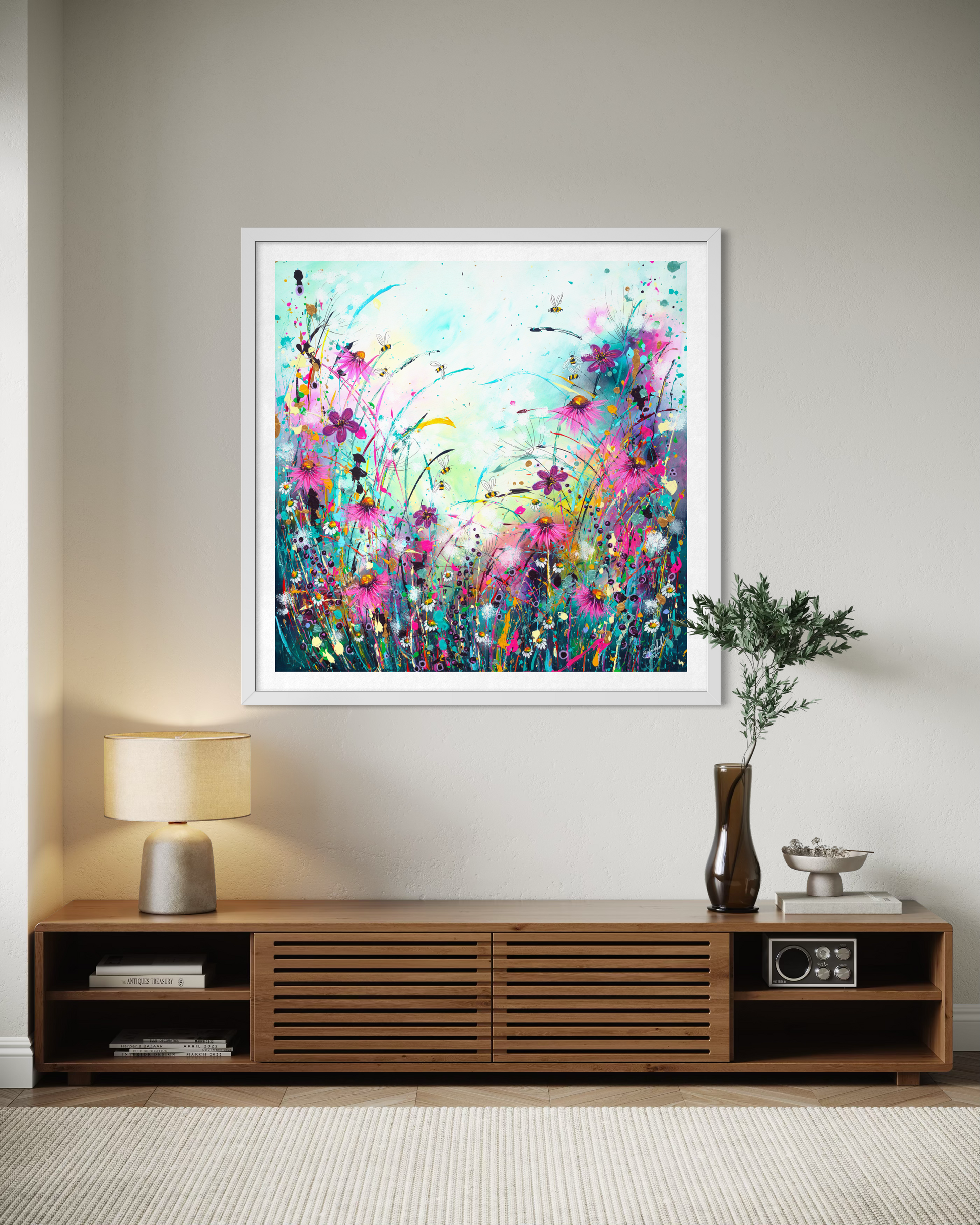 Introducing "Busy Bees" a limited-edition print. This wild flower meadow is flooded with life, with bees and butterfly’s. It is a painting symbolising new growth and