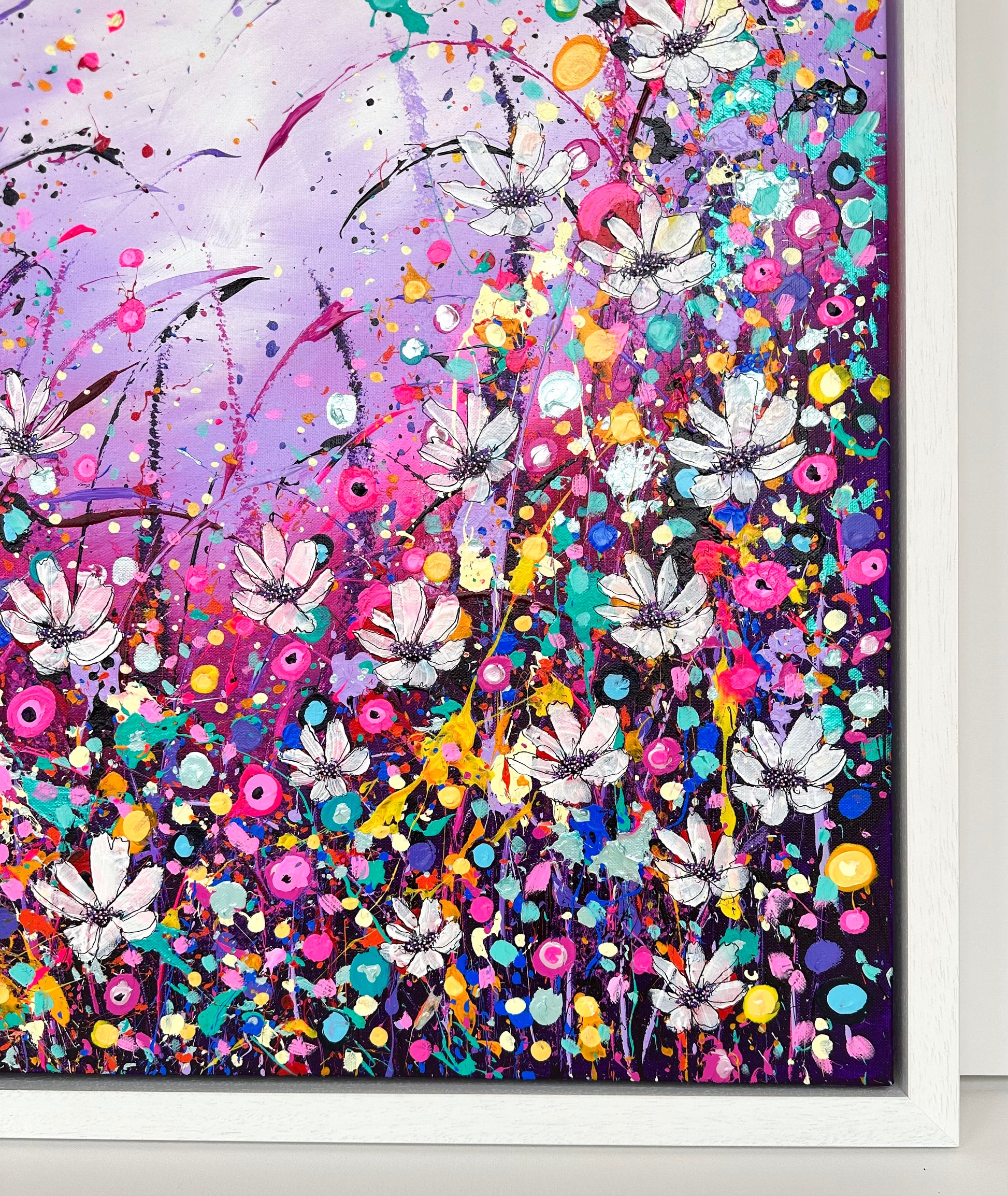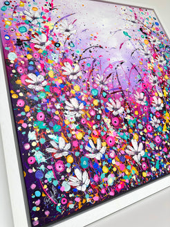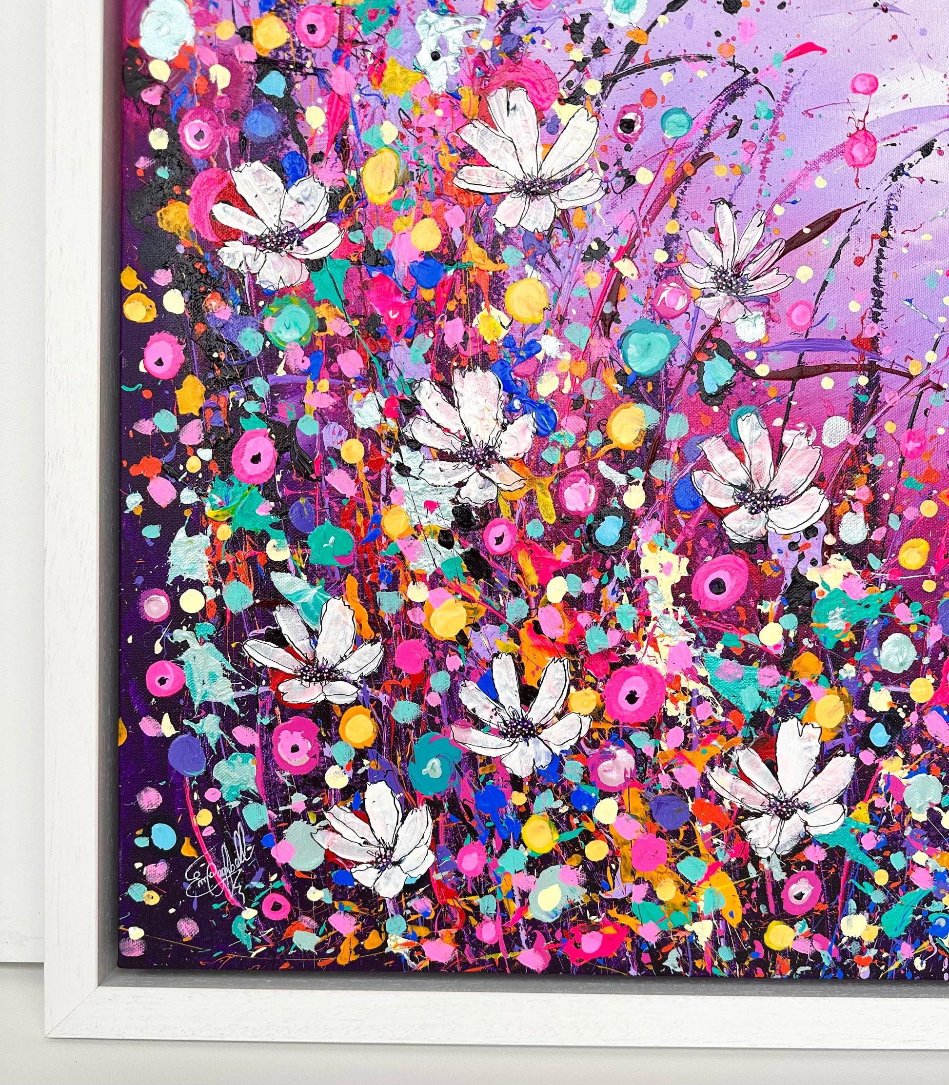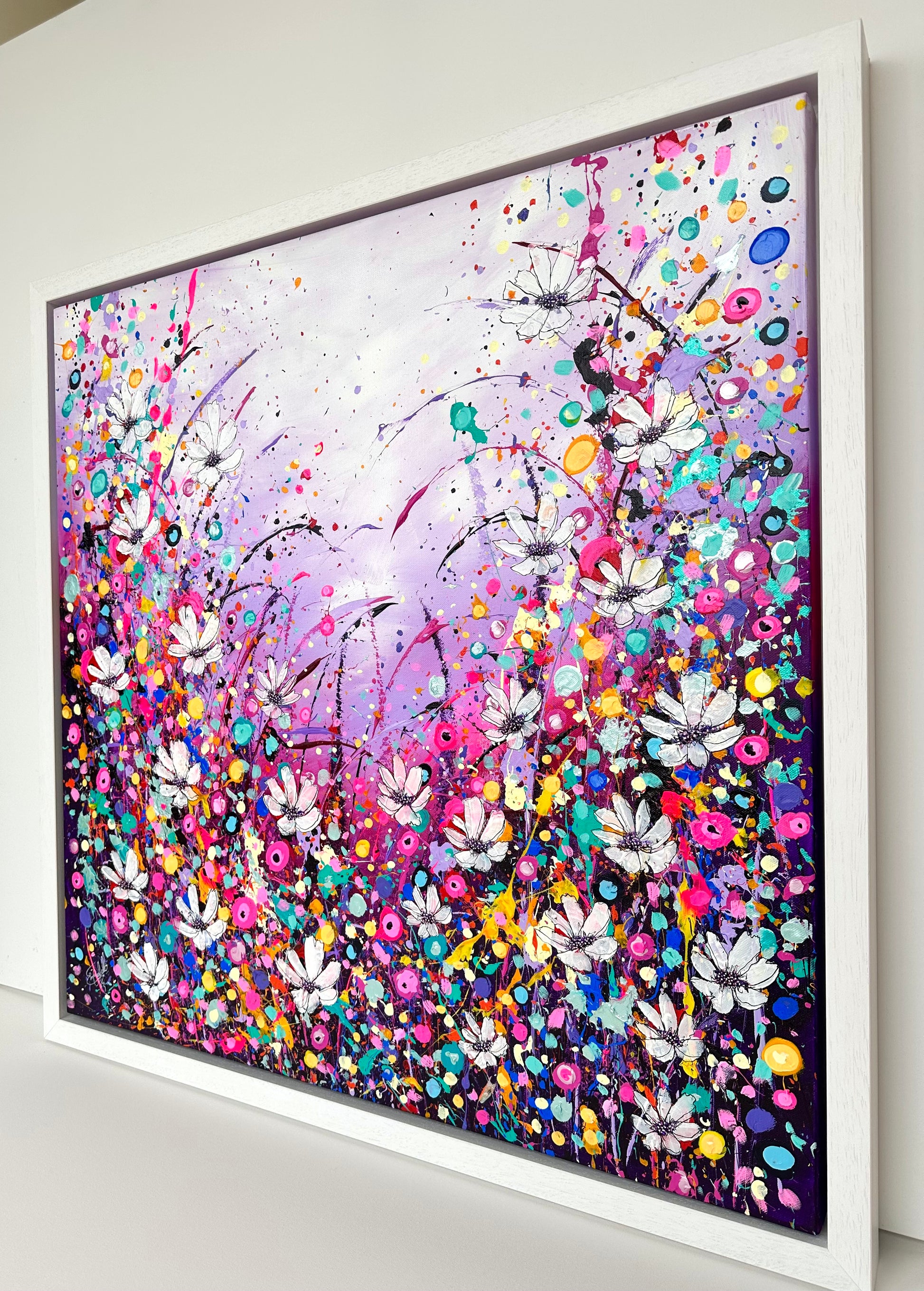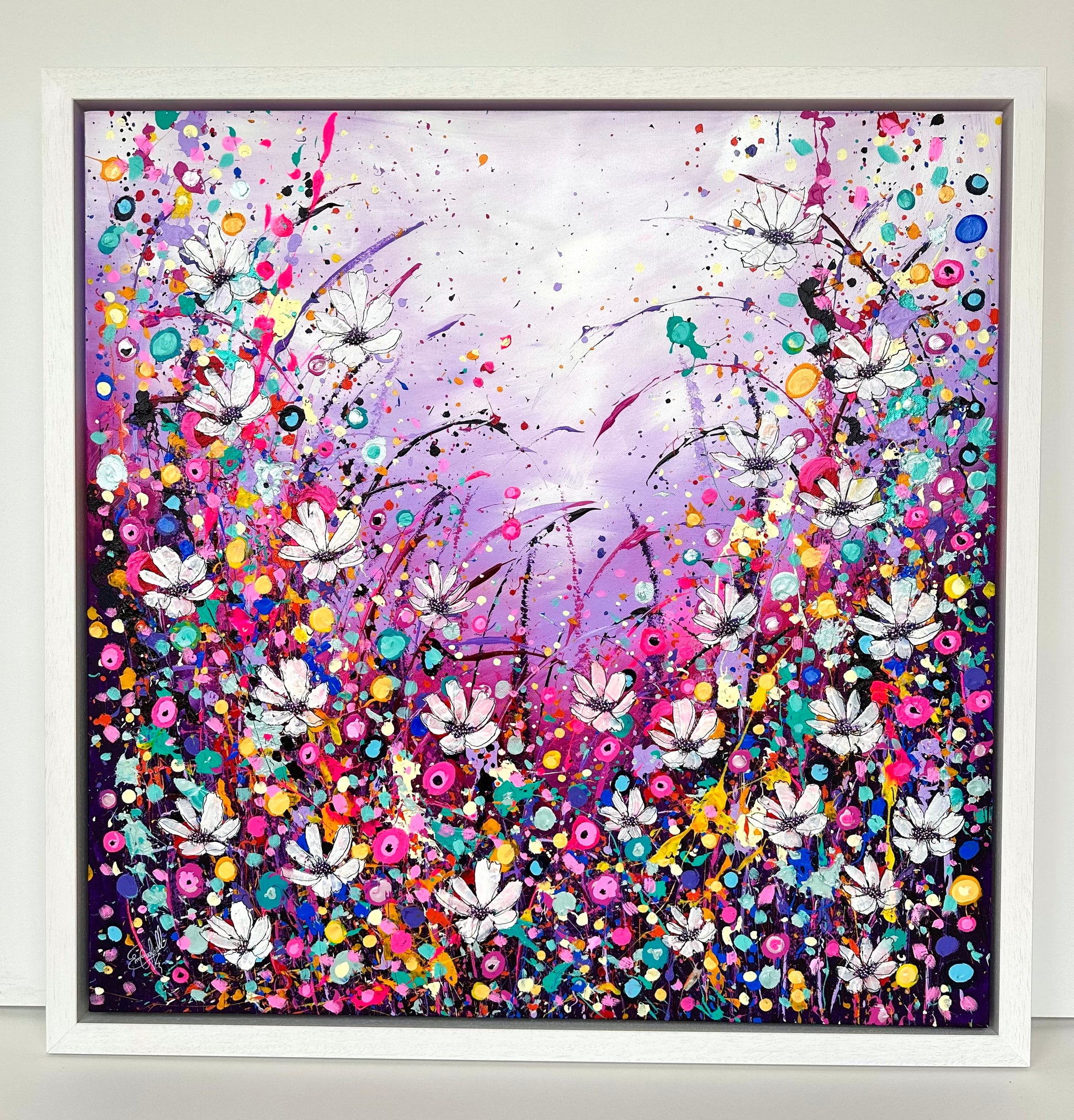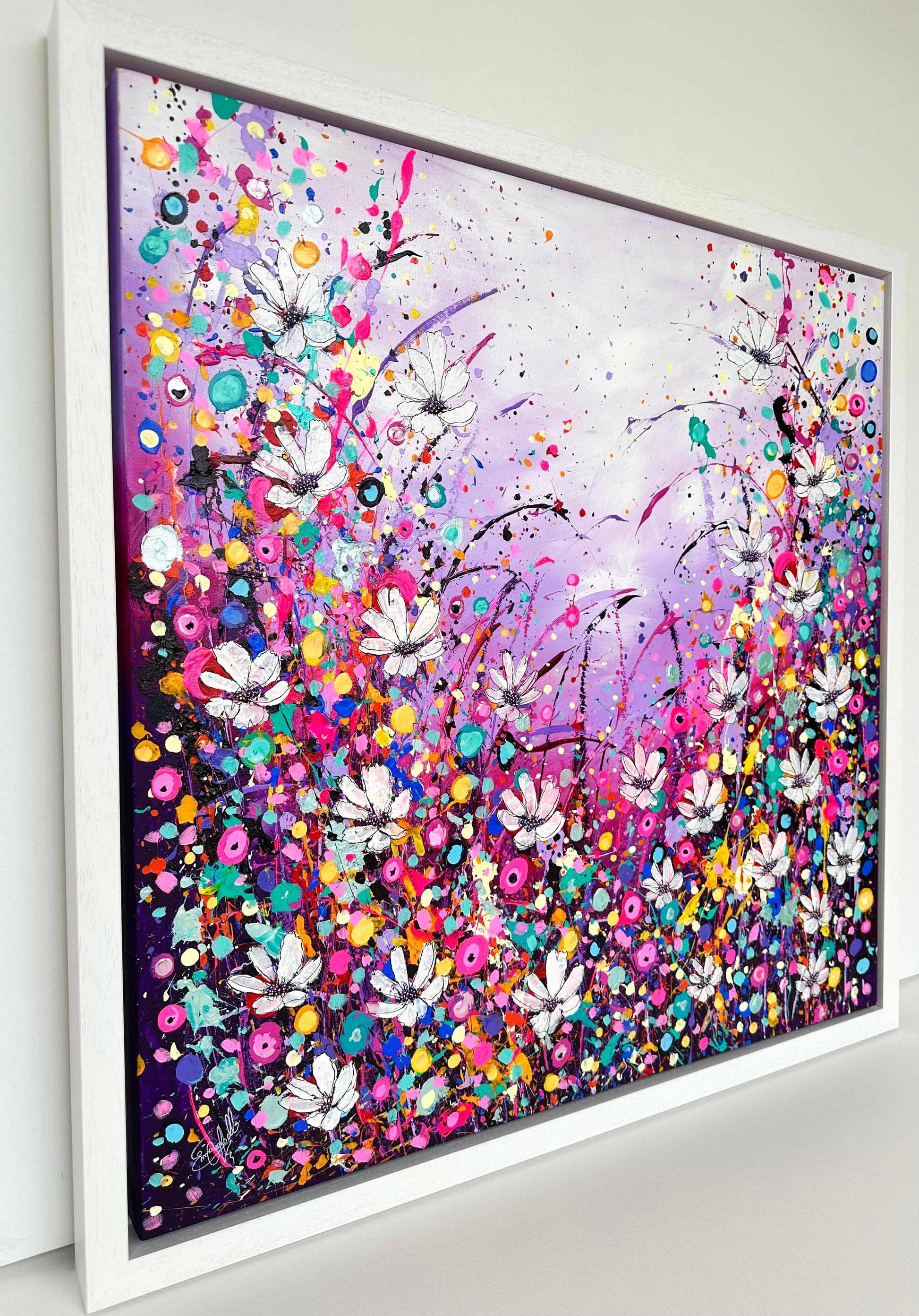‘Let’s Get The Party Started ’ is a new original acrylic painting on canvas from my wildflower Collection. It’s is a fun and energetic piece, reminding me of a party or gathering that’s filled with playful energy. It has quite warm colours of purples and pinks throughout. you can almost feel the wild flowers dancing and chatting away amongst one another. This painting is hand signed and titled, varnished, prepared for hanging and supplied with a certificate of authenticity, measuring a total 88cm x 88cm Floated and Framed.