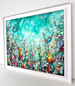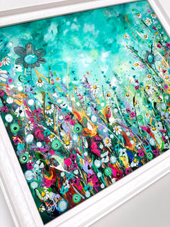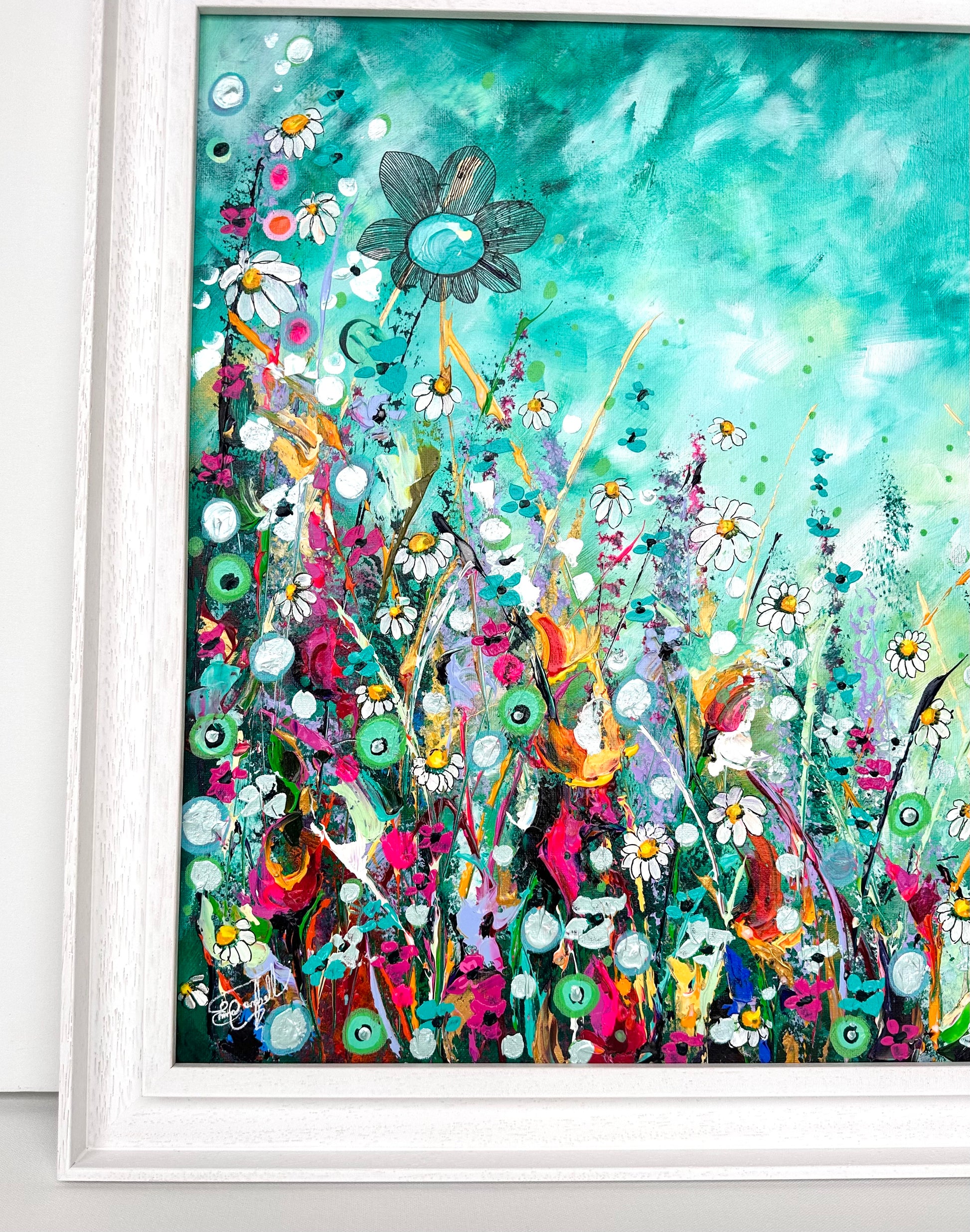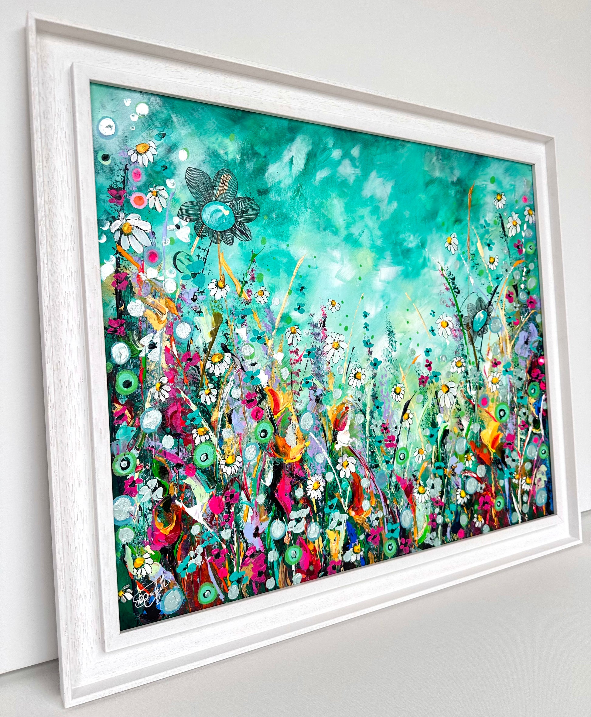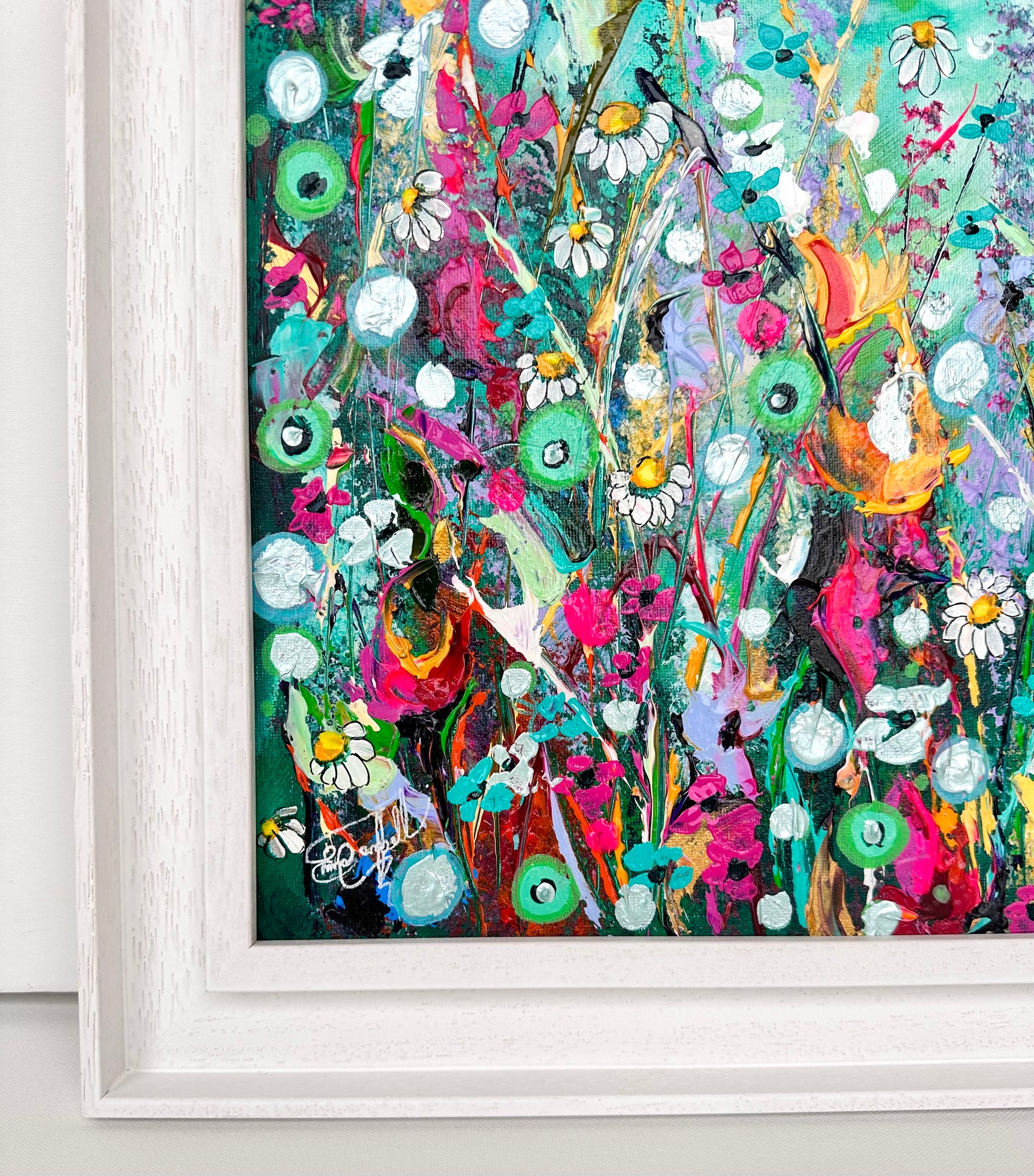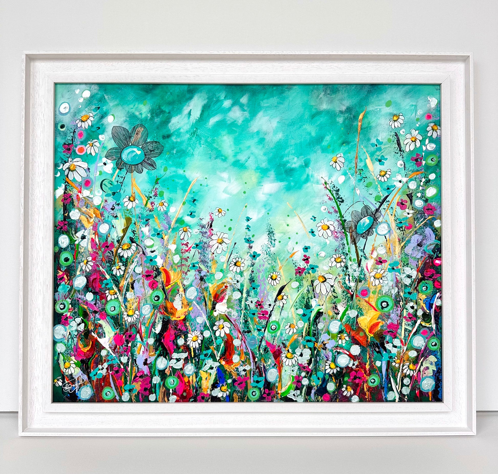 ‘What Lies Beneath’ is a new original painting on canvas from my Wildflower Collection. This painting has beautiful tones of emerald greens throughout. It was painted in late July, from my garden as I watched a meadow of wildflowers I had scattered throughout our lawn. There were lots of bees and butterfly’s hovering over them waiting to feast if some nectar. The Painting is hand signed, varnished and prepared for hanging. It is supplied with a certificate of authenticity, measuring a total 59cm x 79cm canvas floated and framed in a double tray frame.