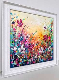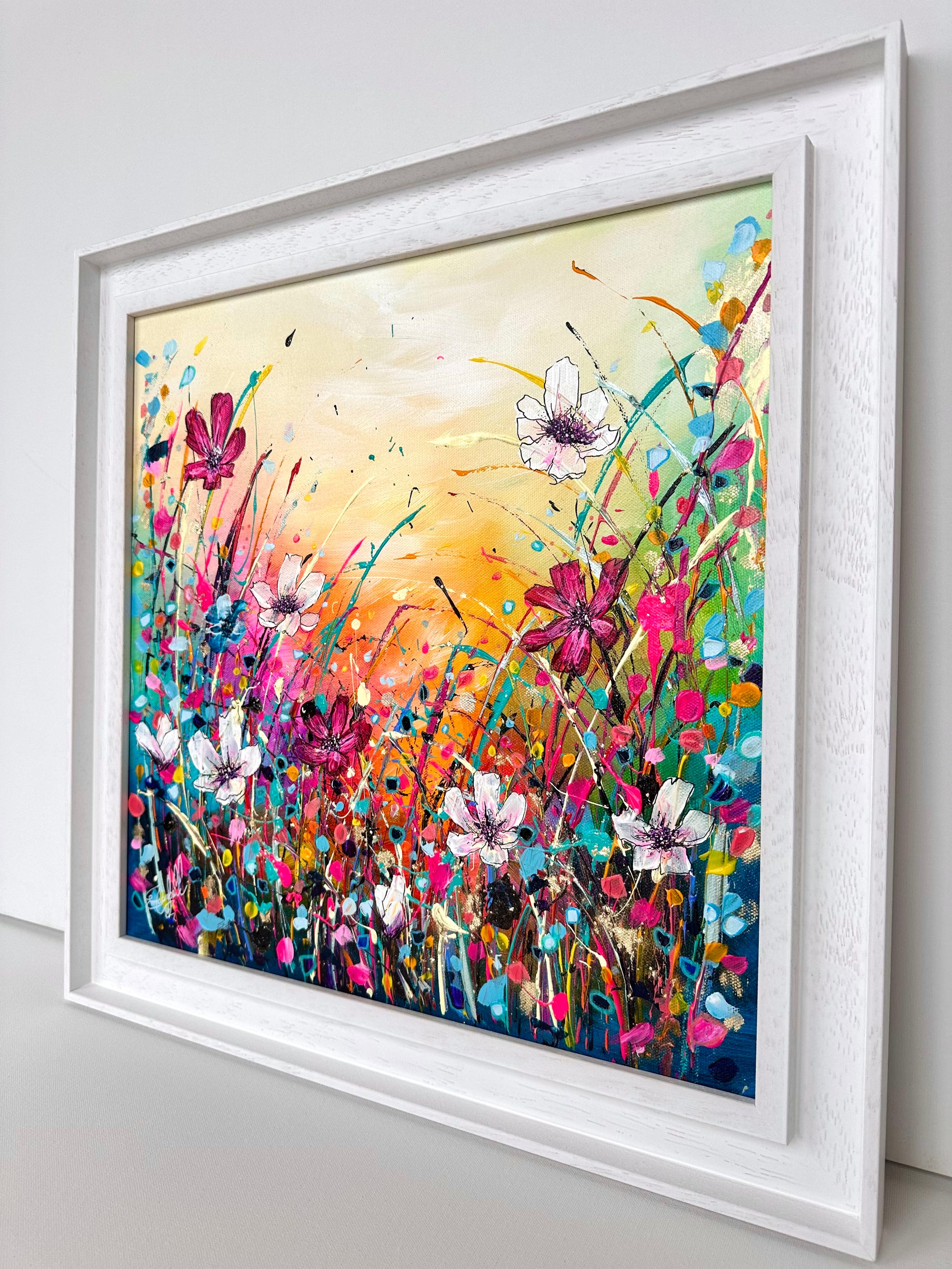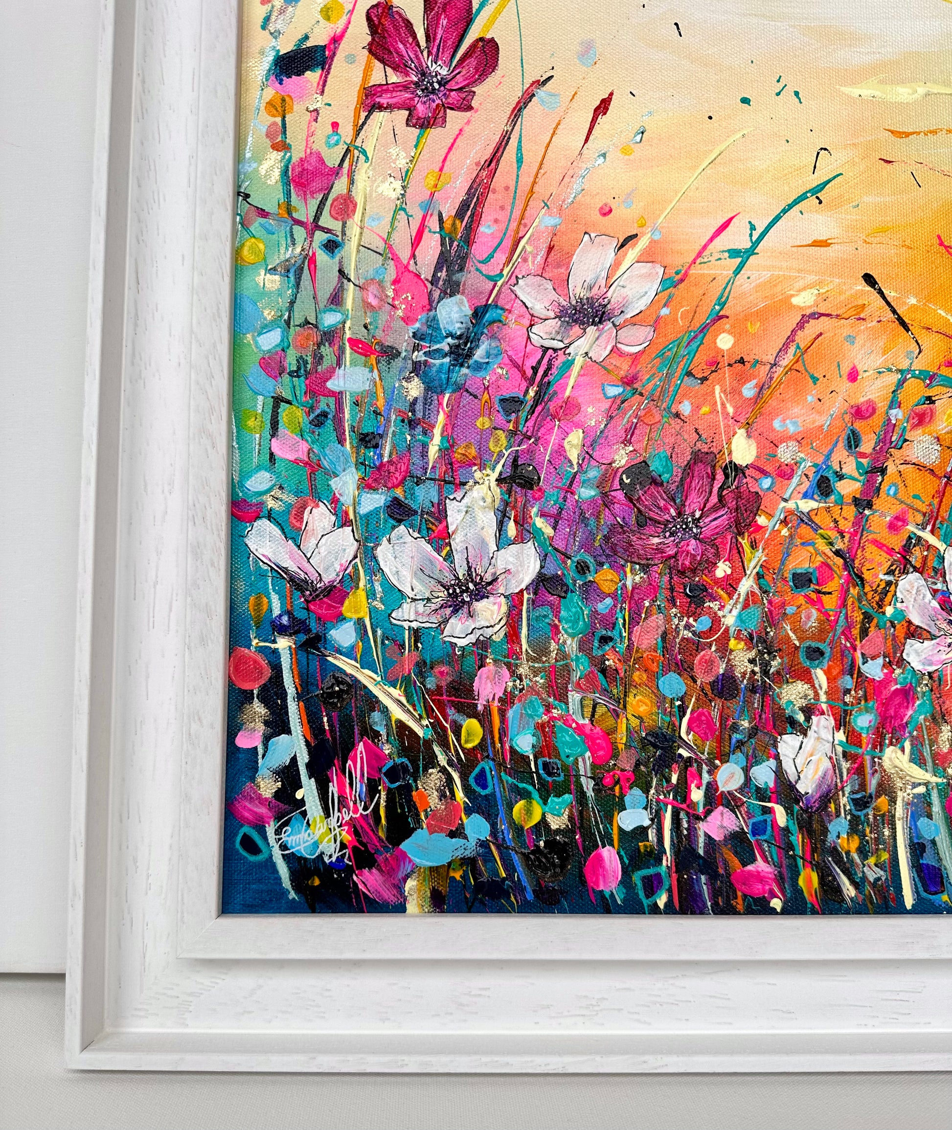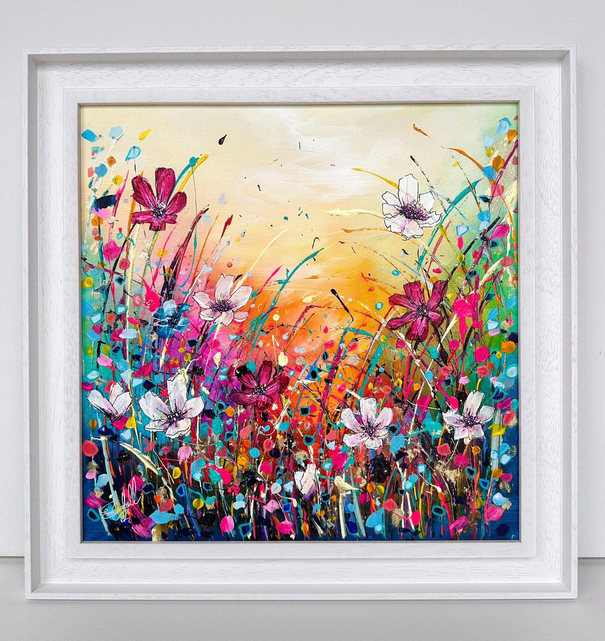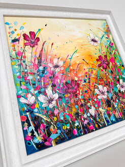 ‘Wildflower Reverie’ is a new original painting on canvas from my Wildflower Collection. This piece has lots of cosmos dancing throughout. The piece itself is symbolic of joy and celebration, capturing what my own wild flower garden gives me through the summer. The Painting is hand signed, varnished and prepared for hanging. It is supplied with a certificate of authenticity, measuring a total 49cm x 49cm on canvas floated and framed in a double tray frame.