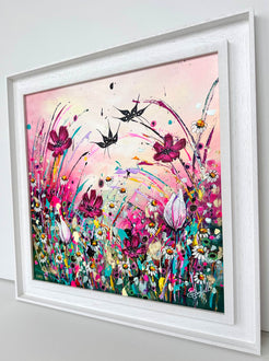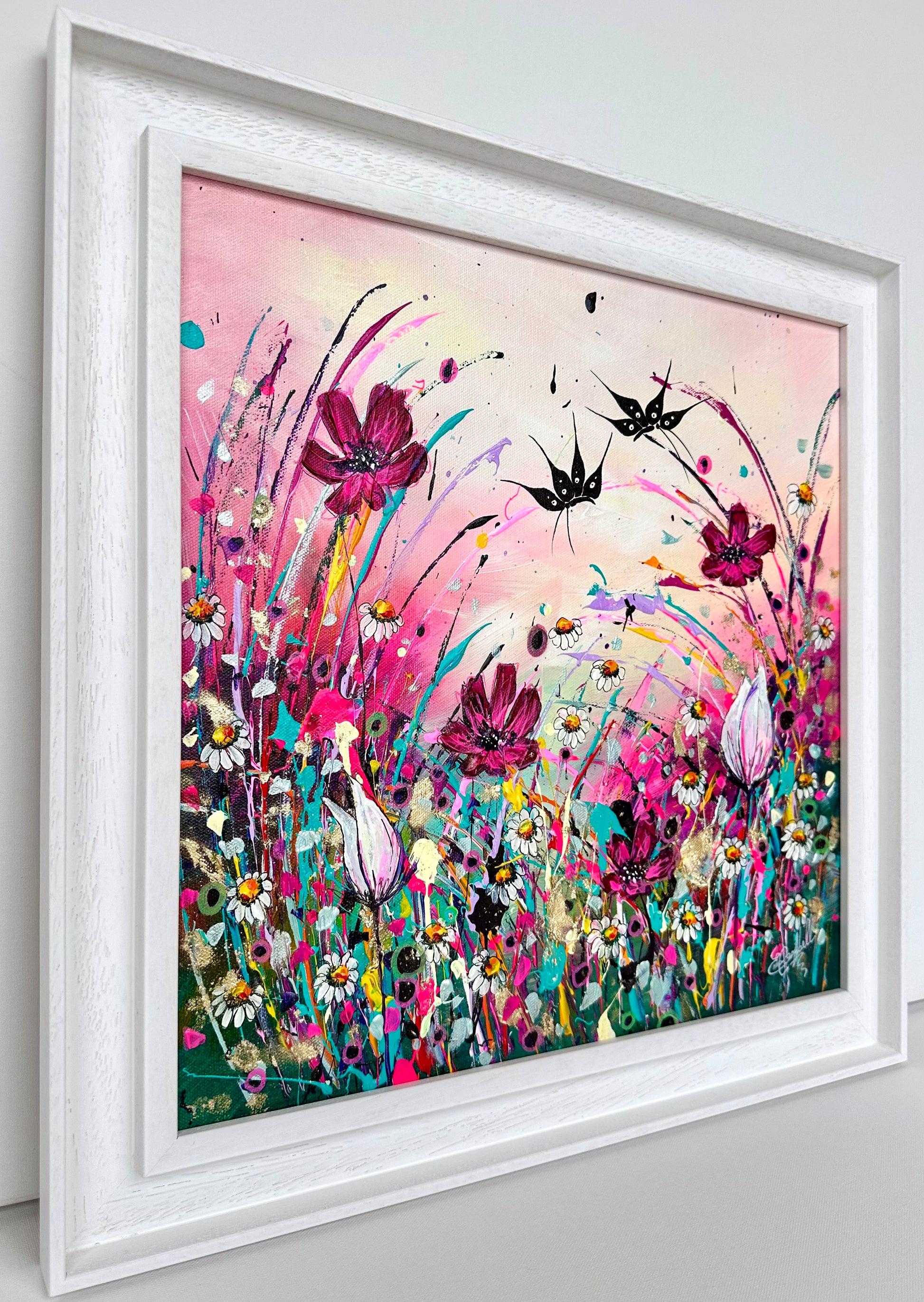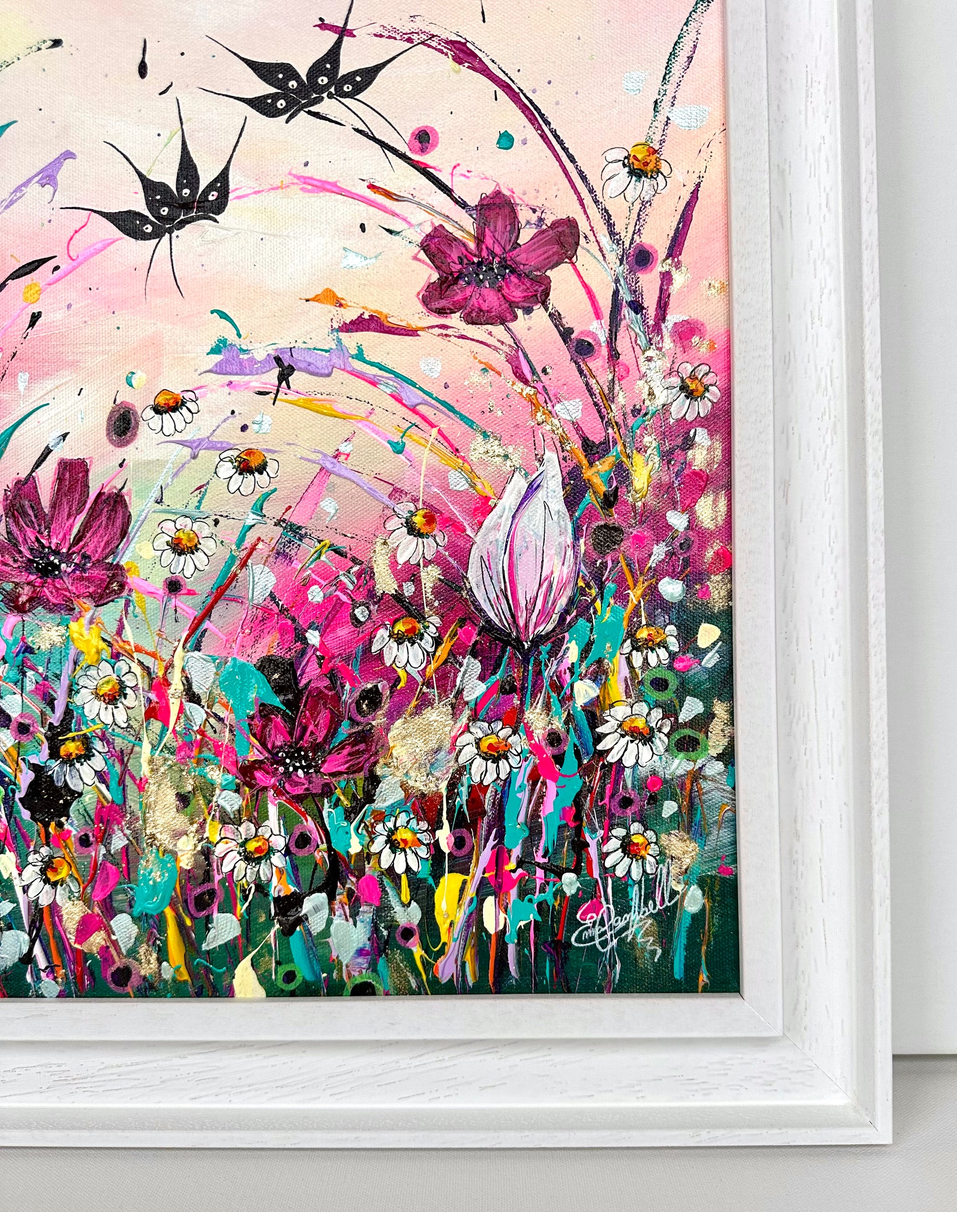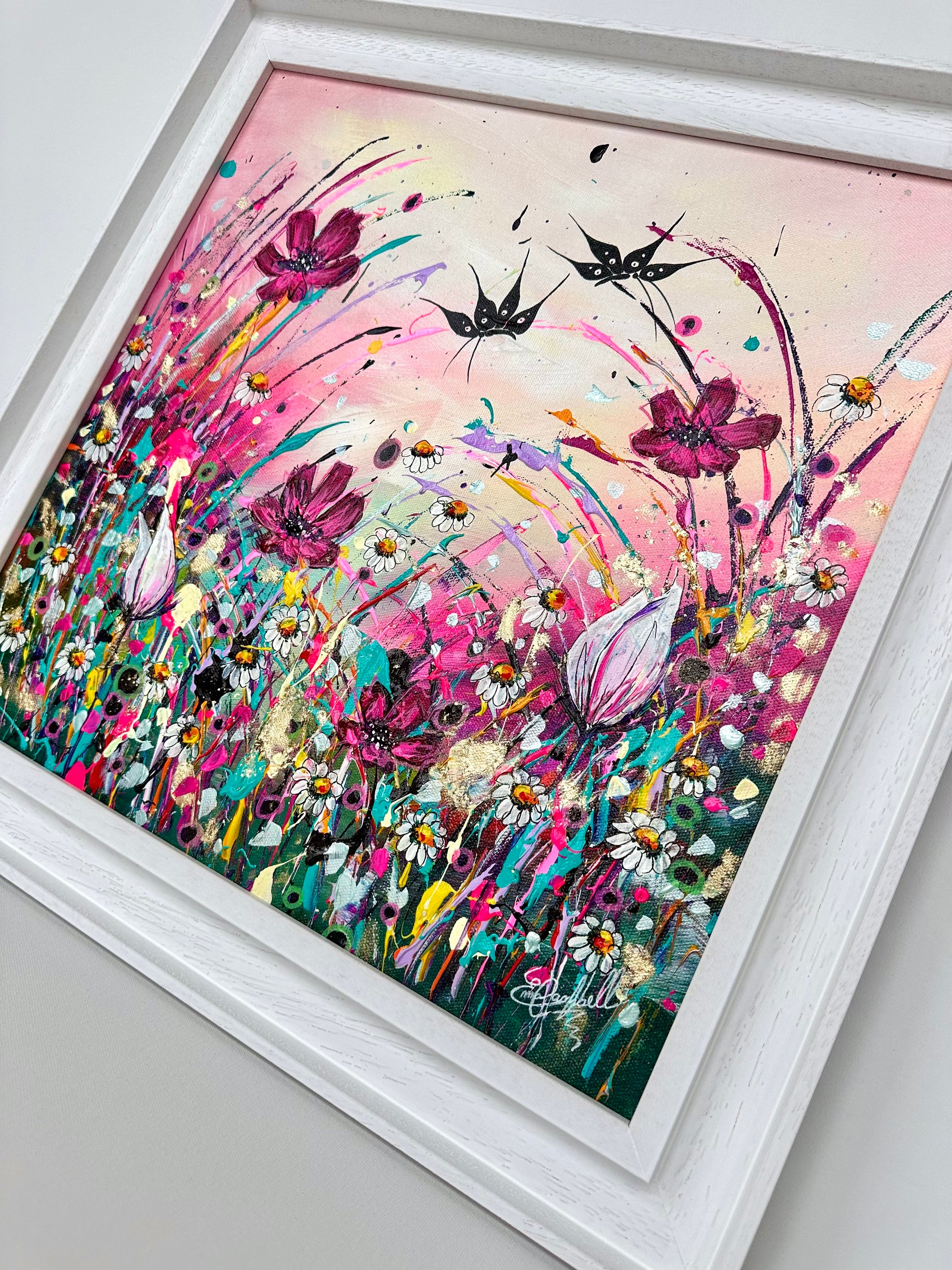‘Bloom Shine’ is a new original acrylic painting on canvas from my butterfly collection. Bundles of Daisies with a rose bud peeping through. Two flowers that often grow near each other. This Painting is embellished in gold leaf which shimmers in the light. It is hand signed, varnished and prepared for hanging. It is supplied with a certificate of authenticity, it is painted on canvas floated and framed in a double tray frame measuring 49cm x 49cm.