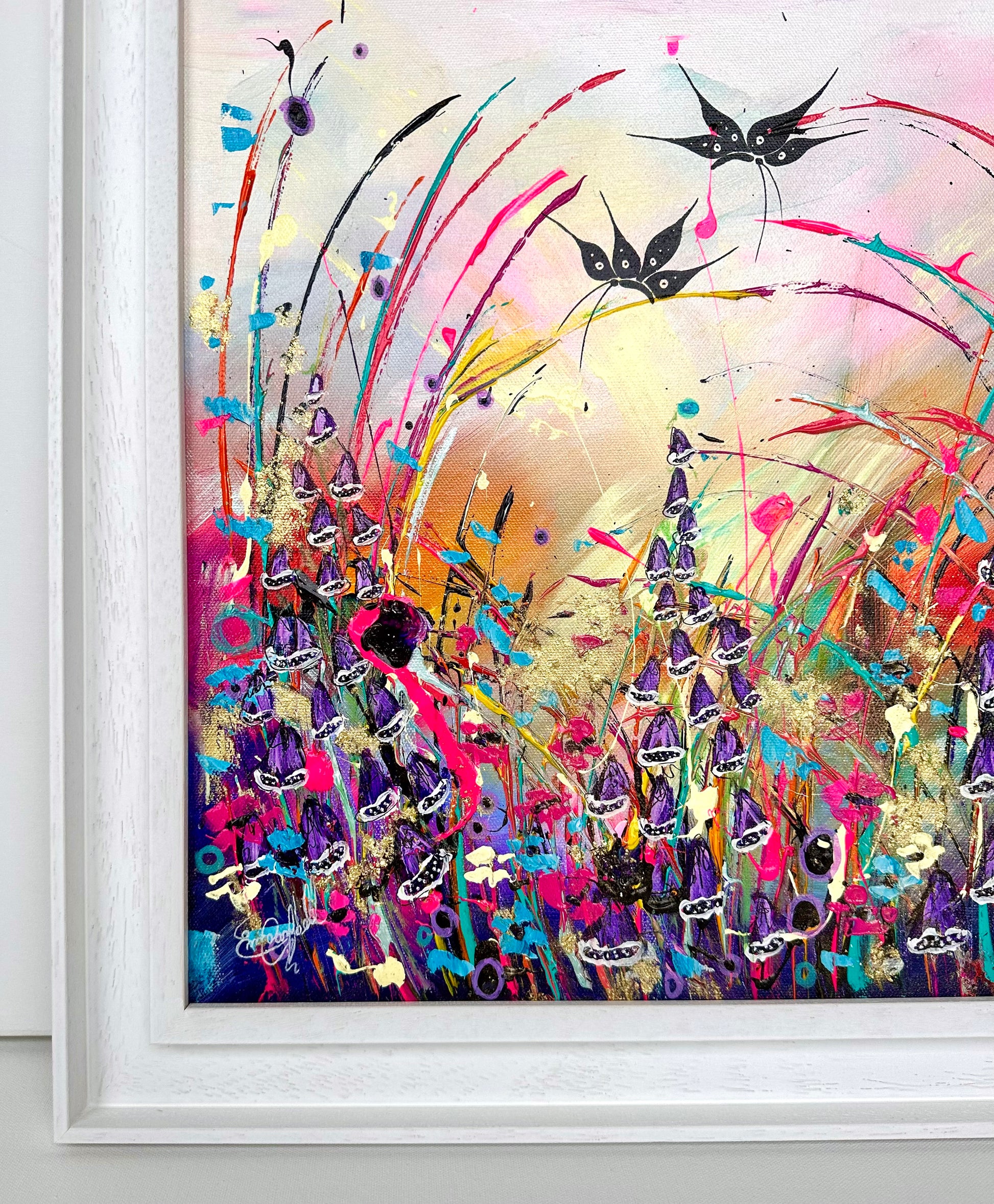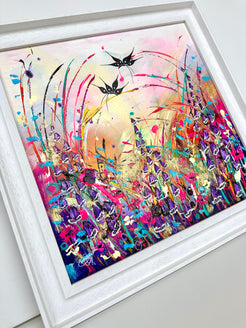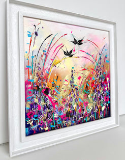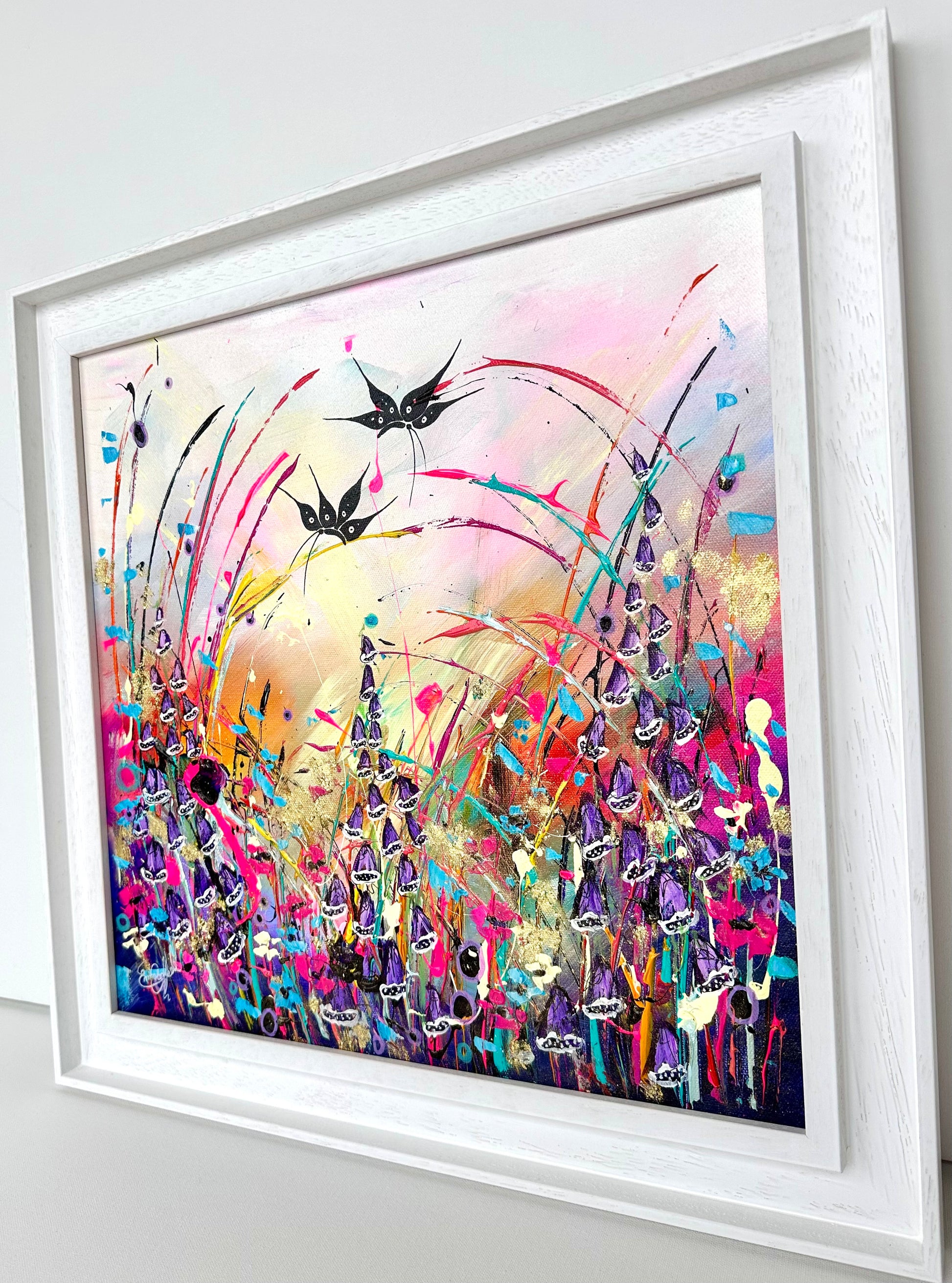 ‘Fluttering In The Sun’ is a new original acrylic painting on canvas from my Butterfly Collection. This painting is embellished in gold leaf, which catches the light so beautifully throwing out gorgeous reflections. The Painting is hand signed, varnished and prepared for hanging. It is supplied with a certificate of authenticity and framed in an elegant doubled tray frame, measuring a total of 49cm x 49cm